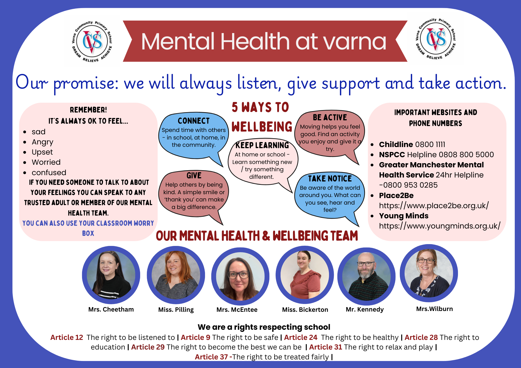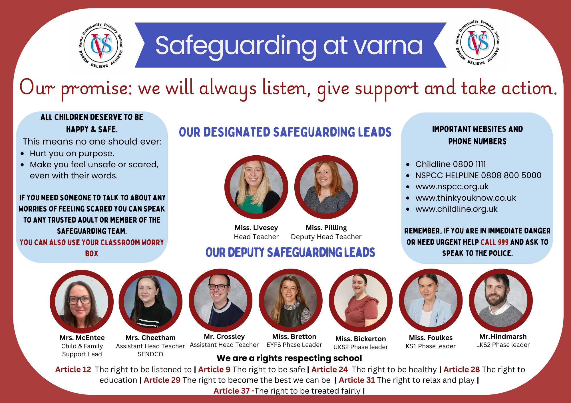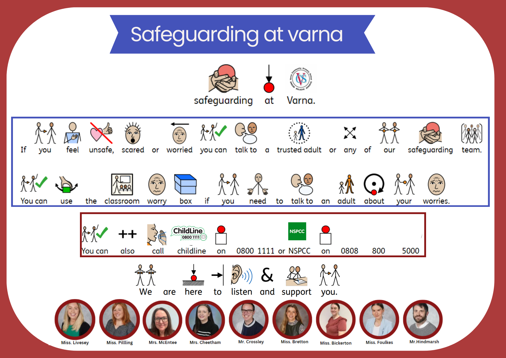 It is important for children to feel safe. Our day-to-day practices, our curriculum and through the use of specialist organisations such as the NSPCC, help empower our children by teaching them how to recognise abuse, stay safe on and offline and to use their voices to speak out. Children are encouraged to talk to a trusted adult if they are worried about anything. This can be done face to face or a note can be put in their class worry box. At Varna, we have a large team who are all identified in posters around school.